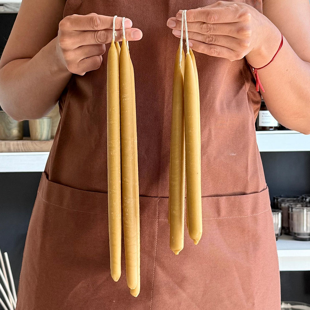 Vela para candelabro formulada exclusivamente con cera de abejas sin aditivos ni colorantes, con pabilo 100% algodón. Hechas a mano por un artesano apicultor, usando una antigua técnica de inmersión por capas. Dulce y natural que envuelve tus sentidos con puro aroma a miel.