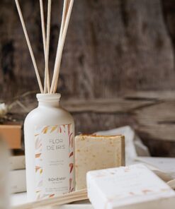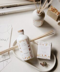 – Difusor Flor de Iris: Frasco de vidrio 250cc color off white con tapón con juego de varillas de rattán.