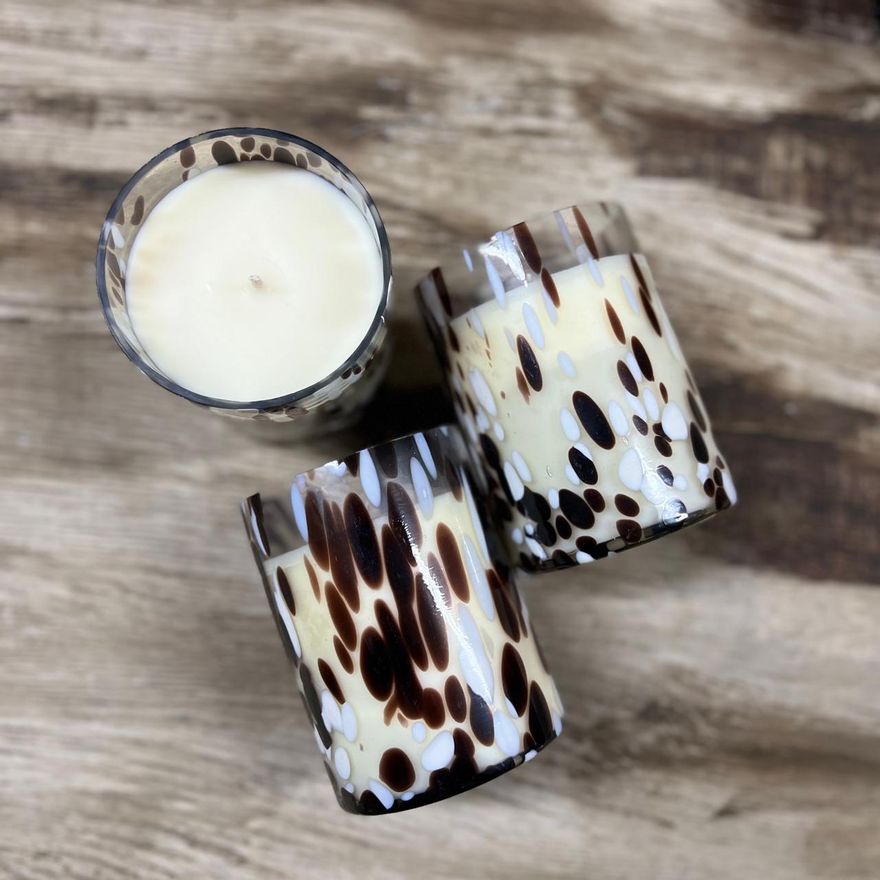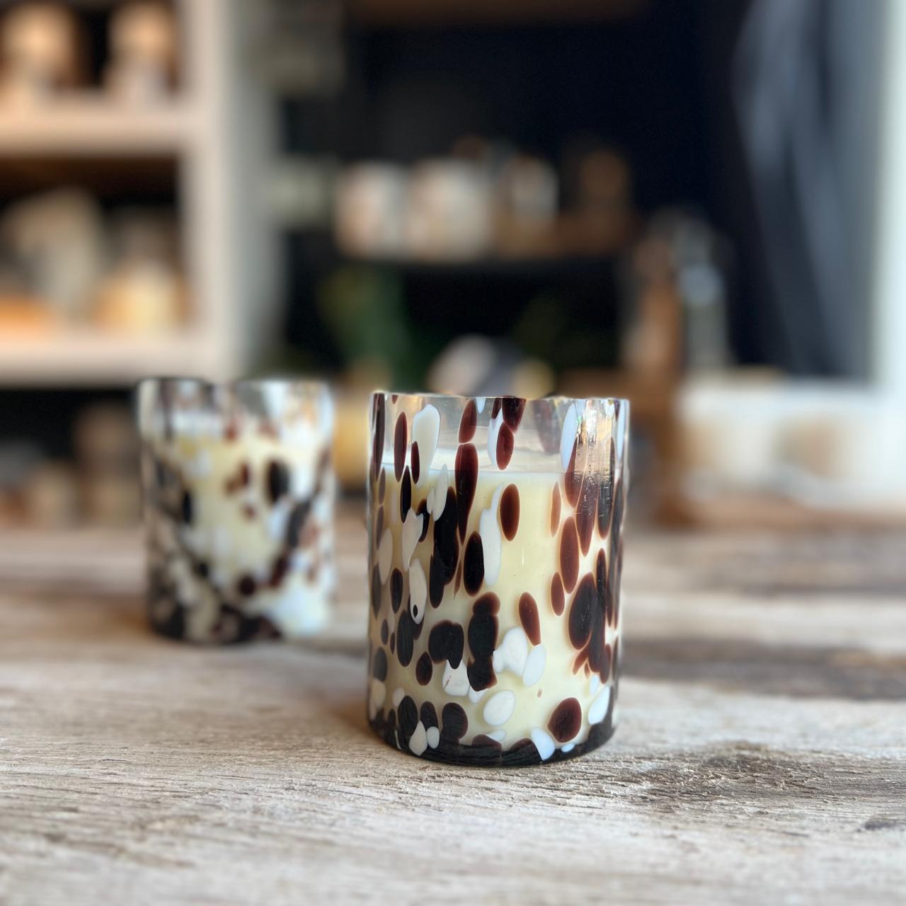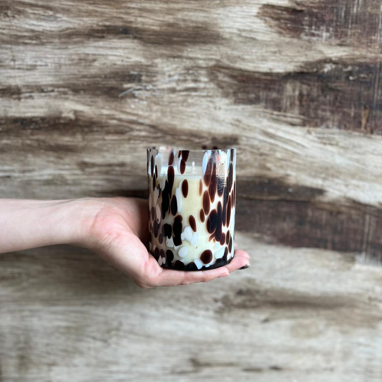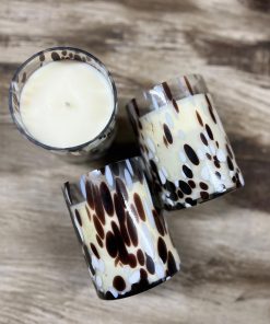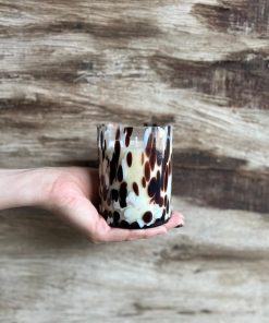 Delicado envase de vidrio de la India decorado a mano con manchitas en tonos marrones, bordo y blanco con aroma que recuerdan a frutos del sur.